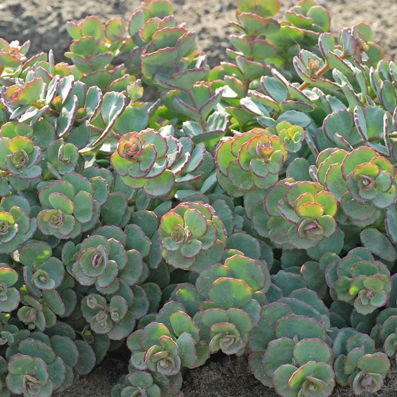 6-12″ tall x 12-15″ wide. This stonecrop is valued for its fall display of deep pink flowers and its arching stems of succulent gray-green foliage. Sedum seboldii October Daphne’s unique and beautiful foliage provides contrasting color and texture when planted with small ornamental grasses and various lavender varieties. This stonecrop provides a last hurrah to fall with its butterfly-attracting flowers. Good for Firescaping